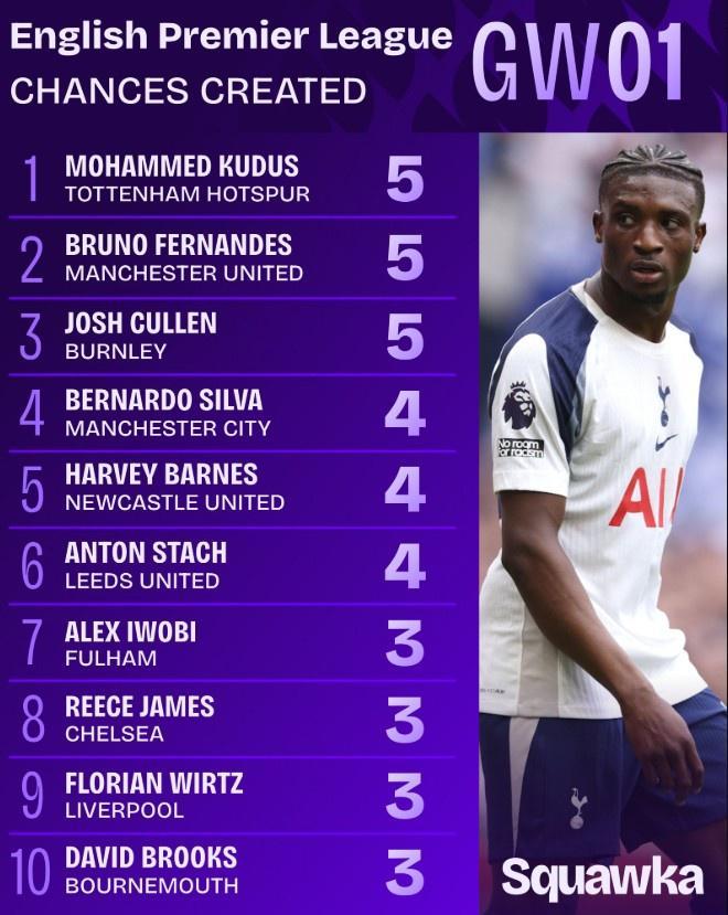 8月20日直播。新赛季的英超联赛第一轮结束了所有比赛。根据Squawka,Kudus,BrunoFernández和Josh Kulun的统计数据,与机会最多的球员有关。值得一提的是,Kudus是第一个在比赛中获得两次助攻的英超联赛。在英超联赛的第一轮机会中,以下10个最佳。 1。Kudus(Tottenham):2分5次。 Brunofernandez(曼联):5局3局。乔什·库伦(Josh Kulun)(伯恩利):4分4次。贝尔纳多·席尔瓦(Bernardo Silva)(4次5)。 Xavi Barnes(纽卡斯尔):4次6。 Stacher(利兹联):4次7次。伊沃比(富勒姆):8次8次。里斯·詹姆斯(切尔西):第三次入场。威尔兹(利物浦):10分10次。大卫·布鲁克斯(Brooks)(出生):3次