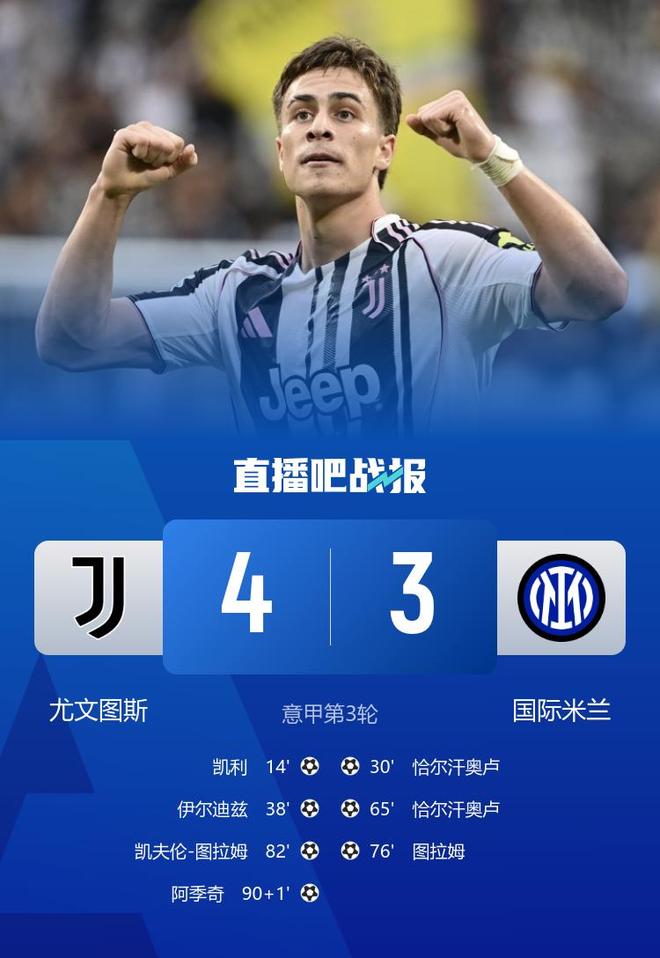 9月14日的现场直播,9月14日午夜,在安联竞技场举行的2025-26赛季的意甲全国A,尤文图斯在家中踢了国际米兰。凯利(Kelly)在上半场取得了第一张纪录,锡亚尔纳尔(Sialhanol)在地面上得分,伊尔迪兹(Ilditz)的世界波再次领先,布雷默(Bremer)进行了两次助攻,下半场得分,锡亚尔哈诺尔(Sialhanol)在下半场得分,完成了双重打击,图兰兄弟(Tulam Brothers)在同一场比赛中得分,世界波浪赢得了胜利。最后,尤文图斯在家中以4-3击败了米兰。尤文图斯在三轮比赛中赢得了两次胜利,并获得了平局,而国际米兰在两轮比赛中失败了。 [游戏中的重要事件]尤文图斯带头!凯利得分,布雷默帮助了!在第14分钟,Locatelli通过了罚球区,布雷默在中间飞了钩,凯利将球推向了球门。 ↓Intermilan被绑在一起! cialhanolu切断了地面!在Itminute 30中,八月从罚球区的左侧退缩,Sialhanor移动了Out削减网络。 ↓尤文图斯再次领先!伊尔迪兹(Ildiz)开了世界上的长途镜头!在第38分钟,布雷默(Bremer)直接传球,从长距离射击,球返回地面并直接飞到死角。夏天无法保存它,尤文图斯2-1 Intermilan! ↓Intermilan被绑在一起! cialhanolu飞过并完成了双射!在第65分钟,巴斯托尼从左十字架上清除了,Zelinsky再次转向球,而Karjanoglu则用胸部停止了球,并得分了。 ↓米兰领先! Turam获得了标题,DiMarco帮助了Corner Kick!在第76分钟,迪马科(Dimarco)在拐角处开着十字架,而小塔姆(Tarm Jr. ↓尤文图斯是一样的!杜兰兄弟(Tulam Brothers)打进了同样的进球,伊迪兹·恩特格(IditzEntegó)球!在第83分钟,Yilditz获得了任意球。他做了一个十字架,凯夫伦·图拉姆(Kevren Tulam)也带领尤文图斯(Juventus 3-3)跨越了球! ↓尤文图斯是最好的赢家! AJiki世界波!在90+1分钟时,阿吉奇(Ajiqi)射击了雷霆,在外面射击了艰难,但萨默(Somer)无法阻止球进入网络。 ↓4分钟游戏的重点,从罚球区的顶部,甜味剂的扫描略微在空中。 ↓在第13分钟,Ilditz偷走了Sialhanoglu,并直通。卡尔插入了一枪,被阻塞和击败。弗拉霍维奇(Vlahovic)飞起来并在角落里开枪。 ↓在第22分钟,巴雷拉踢了一个拐角,巴斯托尼踢到了顶部。 ↓在第29分钟,Locatelli从外面的长距离射击被Mkhitaryan挡住了。 ↓在第34分钟,Digregorio从罚球区的顶部没收了一个Sialhanor凌空抽射。 ↓在第54分钟,Cialhanoglu尝试了罚球区的前部,他的顶部将她射为顶部。 ↓