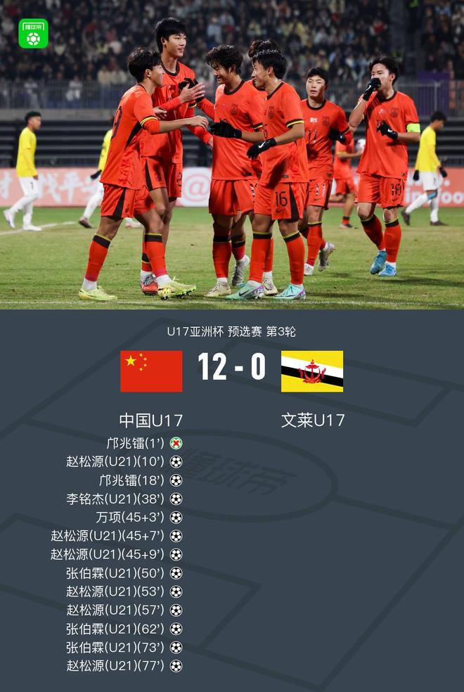 北京时间11月26日,中国U-17队在U-17亚洲杯预选赛第三场比赛中对阵文莱U-17队。赵松源拿下6分+得分,张柏林替补上场上演帽子戏法,王翔1投2传,全超雷得分+失球,李明杰贡献。最终比分是中国U17国足和文莱U17国足12-0。比赛关键的第2分钟,赵松源破门,全超雷射门被扑出。第11分钟,赵松源率先进球,中国队1-0领先。第19分钟,全超蕾再次射门,中国队2-0领先。第39分钟,李明杰头球破门,中国队3-0领先。第45分钟和第4分钟,万向门前两传一射破门,中国队疯狂打进,分钟内4-0领先。 45比9,赵松源帽子戏法第51分钟,中国队再次获胜,6-0。张柏林破门,中国队7-0领先,第54分钟,四巨头成员赵松源射门破门。第58分钟,他得球后头球破门,中国队8-0领先。吴智进球,赵松源补射,第63分钟中国队9-0,取得两位数胜利!张柏林门前破门,U17国足10-0战胜文莱U17。第74分钟张柏林射门破门,完成帽子戏法,中国队11-0获胜。第78分钟,赵松上演第二个帽子戏法,中国队12-0领先。亮点。第2分钟,两队球员均入场,比赛开始。第11分钟,赵松源射门,全超雷射门被扑出。他在第11分钟打进了第一个进球。赵松从源头带球得分。在t第19分钟,中国队1-0领先。在接下来的胜利中,全超雷在第19分钟补射破门。中国队2-0领先。第32分钟,曹松元传球破门。球偏了。第39分钟,李敏杰头球破门。第45+4分钟,中国队3-0领先,2传1射,王翔门前获胜。第45+6分钟,中国队4-0领先,赵松源远射再次获胜,中国队5-0,45+9分钟,太疯狂了,赵松源帽子戏法,中国队第51分钟6-0,再下一城,在第54分钟第1分钟,张柏林破门,中国队7-0领先,四巨头赵松源接球后头球破门,中国队8-0领先。第57分钟,文莱球员疑似手球,但裁判无视。第58分钟吴子进球,赵松源补射,第63分钟中国队取得两位数的胜利,9-0!张柏林门前破门。 U17足球队10-0文莱U17。第66分钟,全超蕾、徐正鹏被换下。金峰、龚希诺作为替补参加。第74分钟上演帽子戏法。张柏林推射得分。中国队11-0。第78分钟,赵本山第二次戴上帽子。宋宋头球破门,中国队12-0获胜。第81分钟,他被金宇辰换下。第88分钟,南子勋替补登场。帅伟豪头球攻门。第90分钟和第4分钟,对方门将在禁区内开出间接任意球。中国队多次射门被封堵。球队阵容技术统计