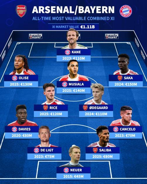 北京时间11月26日,在阿森纳和拜仁慕尼黑即将在欧冠赛场相遇的情况下,德胡安评选出了两家具乐部历史上最昂贵的11人阵容。萨卡高居榜首,2024 年身价为 1.5 亿欧元。哈里·凯恩、穆西亚拉、奥利塞、赖斯和厄德高也榜上有名。德国阿森纳+拜仁史上最贵十一人:门将诺伊尔(拜仁)4500万欧元(2015年)、后卫坎塞洛(拜仁)7000万欧元(2015年)德里赫特(拜仁)2300万欧元(2015年)、阿方索·戴维斯(拜仁)8000万欧元(2020年)中场厄德高(阿森纳米比亚)1.1亿欧元(2024年)、赖斯(阿森纳)1.2亿欧元(2025年)、穆西亚拉(拜仁)1.4亿欧元(2025年)前锋萨卡(阿森纳)1.5亿欧元(2024年)、哈里·凯恩(拜仁)1.1亿欧元(2023年)、奥利塞(拜仁)1.3亿欧元(2025年)总计: 11.1 亿欧元 [在 MiG 上独家观看英超联赛]
